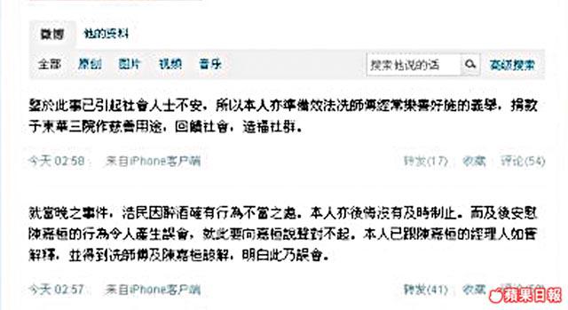 馬德鐘在微博說:「就當晚之事件,浩民因醉酒確有行為不當之處。本人亦後悔沒有及時制止。而事後安慰陳嘉桓的行為令人產生誤會,就此要向嘉桓說聲對不起。本人已跟陳嘉桓的經理人如實解釋,明白此乃誤會。鑑於此事已引起社會人士不安,所以本人亦準備效法冼師傅(陳嘉桓師傅冼國林)經常樂善好施的義舉,捐款與東華三院作慈善用途,回饋社會,造福社群。」