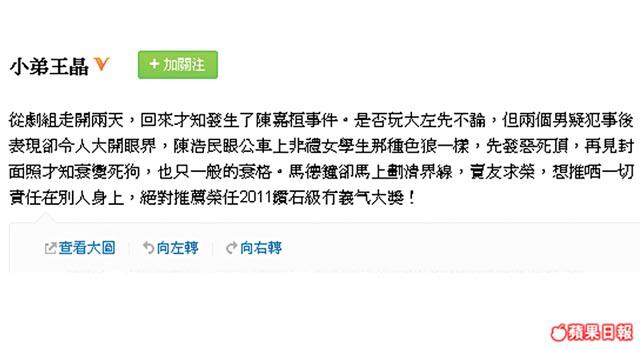 至於陳嘉桓的師傅冼國林昨日說起馬德鐘,雖揚言大家吃過兩次飯,但對馬德鐘的解釋並不認同,言談間更暗寸馬德鐘未有對「細姪女」加以保護,反而乘人之危。馬德鐘都知講多錯多,故他即時刪除微博留言,暫時封口。