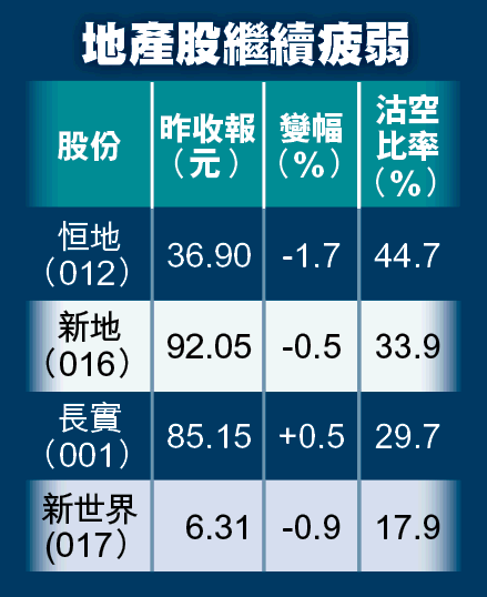 地產股昨一度跌逾2%,其後隨大市回穩,跌幅收窄,恒地連跌8個交易日,昨再跌1.7%,恒隆地產(101)及新世界(017)分別跌1.3%及0.9%。事實上,地產股自10月4日隨大市見底反彈後,近日回吐壓力漸大,普遍較近月高位下瀉一至兩成,明顯較回吐約一成的恒指疲弱,其中受供股問題困擾的新世界,本月更累瀉24%。空軍陣營顯然已盤踞在地產板塊,繼新世界及恒地本月沽空率動輒達三至五成後,長實及新地亦受狙擊,昨日沽空率分別處於29.7%及33.9%的高水平。