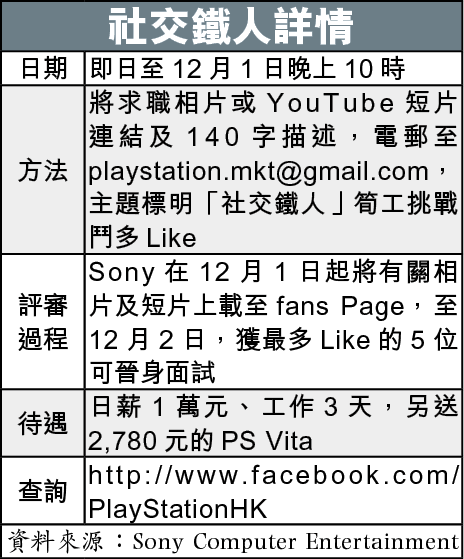 【本報訊】「日薪1萬,三日穩袋3萬,學歷不限,經驗不拘」,這並非求職陷阱,而是下月23日至26日舉行的亞洲遊戲展,招聘一位「社交鐵人」,必須在網絡「勁多人like」,並在展期內透過facebook、微博等平台及YouTube,寫blog、拍片等,推高遊戲展人氣。