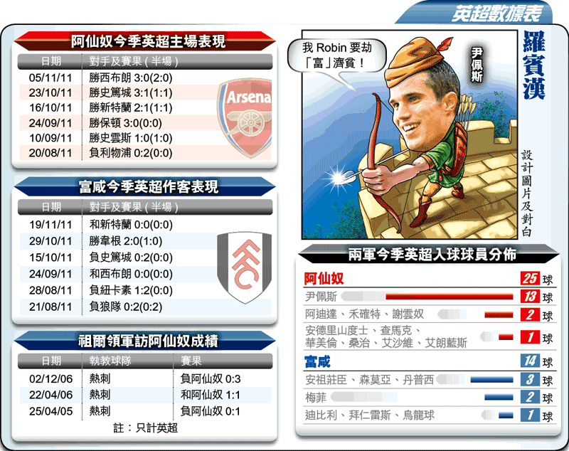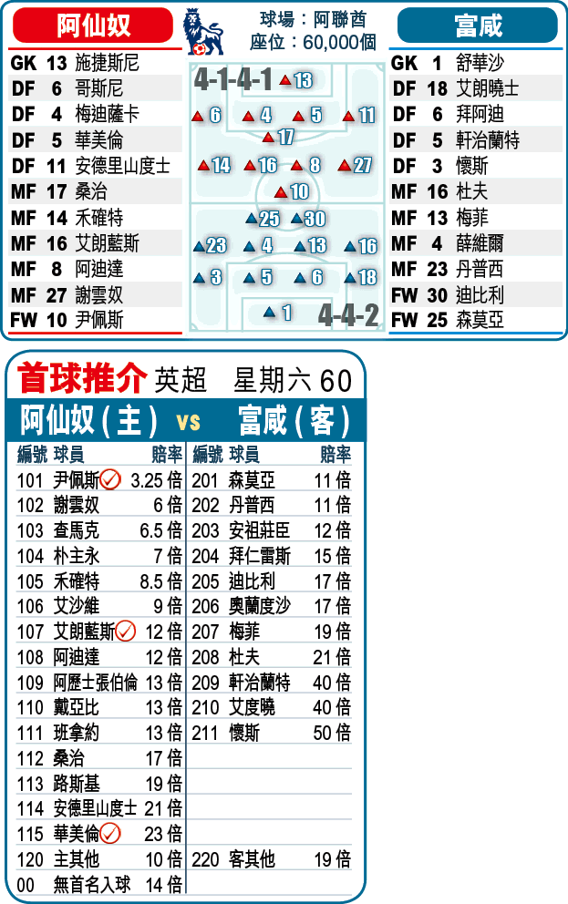 阿仙奴在當「弗」射手尹佩斯帶領下,近來頻頻贏波,加上近年於主場對富咸亦表現好,6戰5勝1和,故必捧[-1]「主勝」;另外,今季聯賽他們有6次是半場打和,可兼吼有4倍的[和/主]。