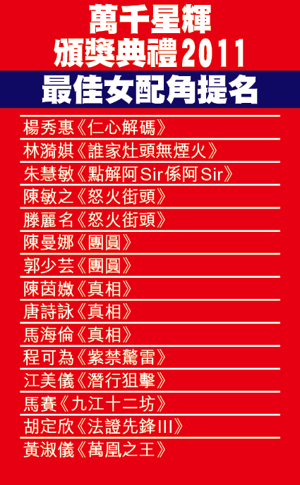 已有幾年在萬千星輝頒獎禮沒任何提名的楊秀惠,今次憑《仁心解碼》獲提名最佳女配角,她直言感意外:「部劇09年拍完之後賣埠去馬來西亞,到今年先攞番出嚟播,雖然係遲咗,但估唔到年初播仲有人記得。」