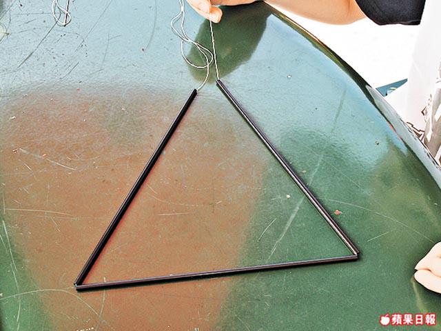 綁緊棉線就成了三角錐體支架。
