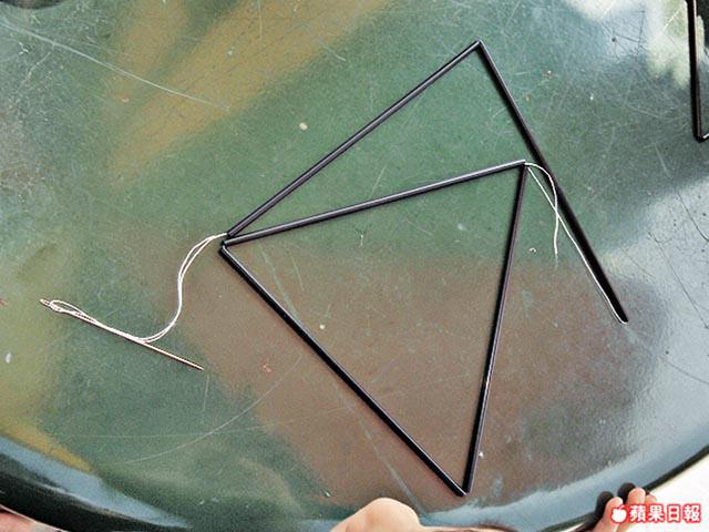 以針穿線穿過飲管形成三角,在末端打結。