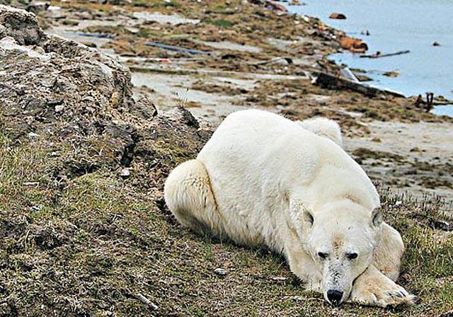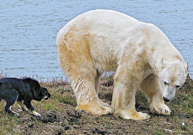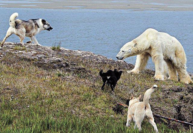 北極熊身為陸上最龐大的肉食動物,竟然被狗欺侮也不敢反抗!這隻瘦得見骨的北極熊,游到俄羅斯西伯利亞偏遠的別雷島(Bely),企圖走近島上氣象站翻垃圾桶找食物之際,一隻狗眼見北極熊要走近主人,竟不顧自身安全,英勇地衝前兇狠地狂吠,接着再有兩隻同伴加入,三犬齊吼,成功震懾體形比牠們大幾倍的北極熊,只見北極熊最後「頭耷耷」轉身走開,一臉慘情伏在稍遠處的地上。英國《每日郵報》