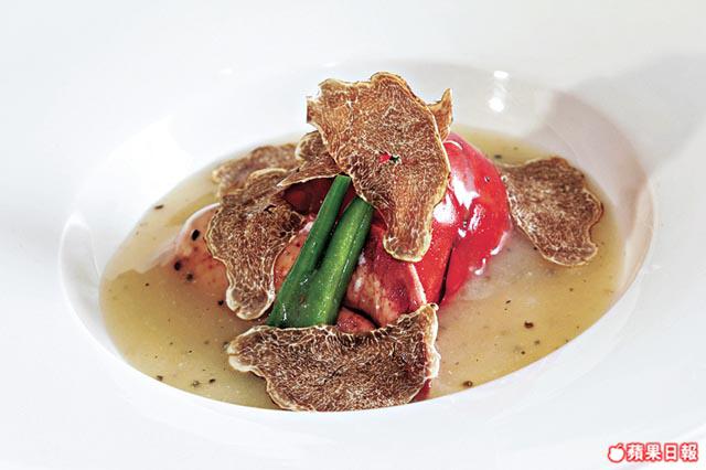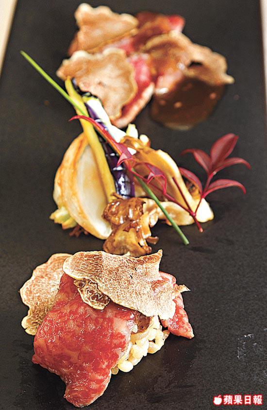米芝蓮1星懷石料理食府WagyuKaisekiDen行政總廚HiroyukiSaotome,以宮崎和牛配白松露。用上最高級的宮崎A5和牛,製作出兩種不同的食法,其中將和牛柳切成薄片,加鹽及胡椒略煎,肉質鬆軟,伴上白松露油、橄欖油、10年Balsamic黑醋及日本豉油混製醬汁,風味特別。因為西冷油份較多,所以較適合做壽司,略煎後放在加上日本紅醋的日本新潟米上,再配白松露菌片,味道香甜。另一道則用上波士頓龍蝦,貪其味道甜,肉質結實。
