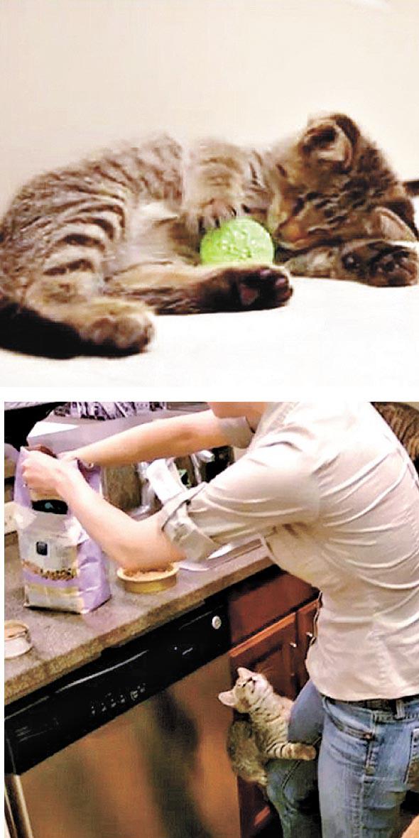 半歲小貓「奧斯卡」(Oskar)天生失明,但跟一般貓咪一樣活潑愛玩,主人早前送牠一個內有叮噹的小球(上圖),「奧斯卡」最初有點迷惘,但很快就繞着球兒打轉,玩得投入非常。主人說「奧斯卡」沒因失明而變得膽小,會跟風筒吹出的風「打架」,肚餓時又會攀上主人的腿撒嬌(下圖),家中八歲貓老大也對牠寵愛有加,容忍小貓「襲擊」。主人把「奧斯卡」的生活點滴拍片放上YouTube,一個月內吸引300萬人次點擊。英國《每日郵報》