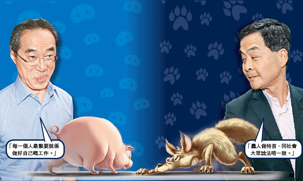 【本報訊】梁振英表明今天「入閘」選特首前夕,民望墮後的唐英年昨突然「搶閘」宣佈去馬,並預告周四有誓師大會,霎時搶盡梁振英風頭。忽然處下風的梁振英如狼似虎反撲,主動指社會不支持「蠢人」當特首;著名影星周星馳加入豬、狼對決戰場,公開挺唐的他,表明不會與蠢人做朋友。記者:林俊謙、鄭啟源、倪清江
