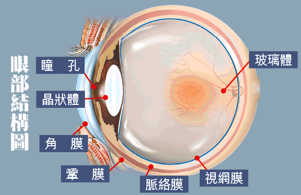 眼球由外至內可分為鞏膜、脈絡膜和視網膜三層組織,鞏膜即是眼白位置,視網膜負責影像接收,脈絡膜則是眼球內最多血流量的地方。