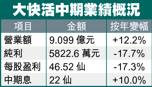 【本報訊】大快活(052)截至9月底止中期純利倒退17.65%至5822.6萬元。公司去年同期錄得一筆1563.3萬元出售非流動資產的收益,若撇除相關項目,公司核心利潤按年增5.7%至5510萬元,每股盈利46.52仙,派中期息22仙。盈利倒退之下,公司於昨午公佈業績後,股價隨即受壓,全日收報10.18元,跌逾2%。