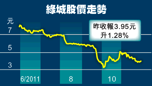 綠城昨股價升1.3%至3.95元。早前曾傳出財困的綠城,先後有報道指獲多方磋商出手援助,包括阿里巴巴集團主席馬雲呼籲員工買綠城樓盤;融創中國(1918)主席孫宏斌以個人名義買入綠城無錫香梓園一套物業;傳出杭州政府計劃注資綠城後;以及與首創置業(2868)商合作等。