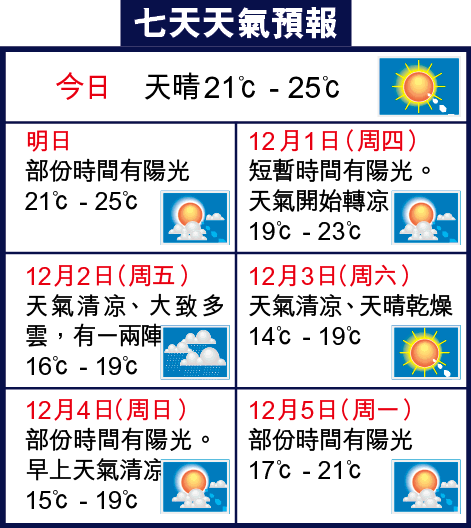 天文台預測今日天晴乾燥,氣溫與昨相若,市區介乎21至25度,吹和緩東至東北風。天文台科學主任楊威龍昨表示,受到一股逐漸南下的東北季候風影響,本周中期雲量逐漸增多,氣溫下降。