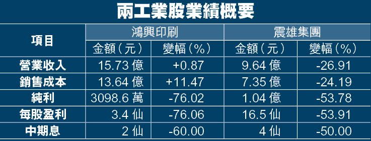 【本報訊】內地通脹持續,加上歐美經濟差令需求下降,拖累工業股盈利下挫。兩隻工業股昨公佈嚇人的半年業績,其中震雄集團(057)純利挫54%至1.04億元,鴻興印刷(450)純利更暴挫76%至3098.6萬元。兩公司均表示經營前景仍充滿挑戰,短期內料難扭轉劣勢。 記者:董曉沂