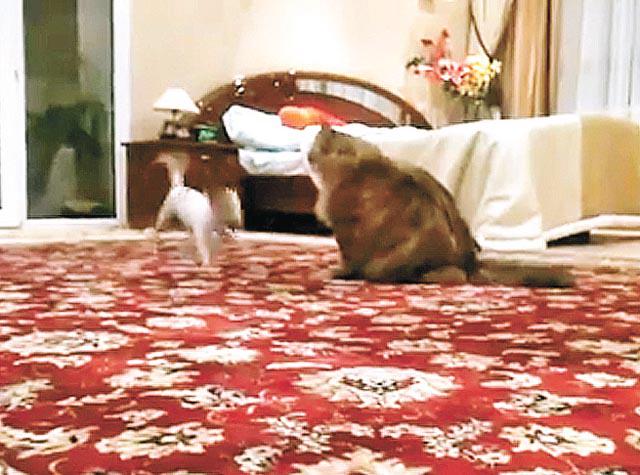 大肥貓原本在客廳乖乖坐着,一臉與世無爭,同一屋簷下,活潑小狗卻苦無對手,只好在貓貓面前高速跑來跑去,嘗試挑釁(圖)。大肥貓一再伸出前爪還擊,可惜敏捷度跟小狗差天共地,連小狗汗毛也碰不着。豈有此理?大肥貓不發火就被當作病貓,大肥貓終於發火,奮力站起來奔向小狗,可惜團團轉了幾秒鐘已筋疲力盡,不得不停下來。小狗卻恍如患過度活躍症,繼續閃來閃去。大肥貓自知不敵小狗,惟有避走出客廳,偏偏小狗緊隨其後,繼續挑釁。大肥貓真的要被小狗玩殘了。YouTube網站