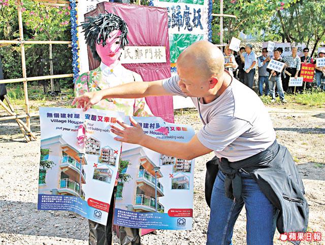 政府5個月前公佈處理新界村屋僭建物方案,違例較輕和風險較低的僭建物,引入登記制度暫緩執法,但風險高則要清拆。新界27鄉鄉事委員會昨天安排多輛旅遊巴,接載各鄉的村民到沙田鄉議局大樓出席「焚燒」活動,大會更為林太搭建了一個靈堂,橫匾寫上「妖去民安」,輓聯則寫上「專責局長強行拆屋、村民無家歸」。不過昨晚有元朗大棠村民向本報爆料,指部份村民其實不知情,只是報名參加了新界鄉議局大樓一日遊,無奈成為活動佈景板。