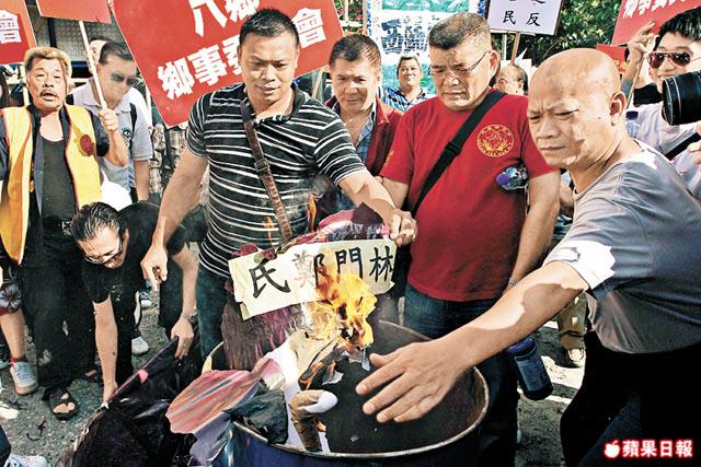 【本報訊】逾1,500名新界原居民昨日齊集沙田鄉議局大樓對出空地,焚燒發展局局長林鄭月娥的紙紮公仔及寫上「林門鄭氏」的紙棺材,又大撒溪錢,抗議林太強行清拆他們的家園,要求她「血債血償」。元朗十八鄉鄉委會主席梁福元要求暫緩執行清拆令,否則將有更激烈的抗爭行動,譬如動員村民包圍政府總部。另有鄉議局執委鼓吹村民若收到屋宇署清拆令,可提出上訴,用拖字訣逃避家園被拆的命運。記者:譚靜雯
