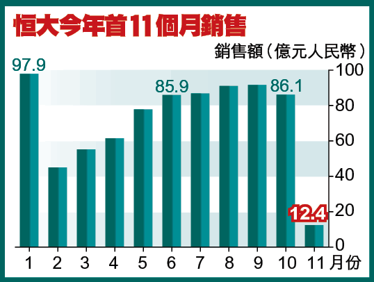 【本報訊】早已於10月份完成今年700億元(人民幣.下同)合同銷售目標的恒大(3333),隨即於11月份調整銷售步伐,令公司上月合同銷售金額只有12.4億元,成為今年以來最差單月銷售,按月銳減85.59%之餘,與去年同月65.6億元的全年最高合同銷售額比,按年亦勁退81.09%。 記者:張活儀