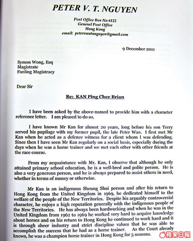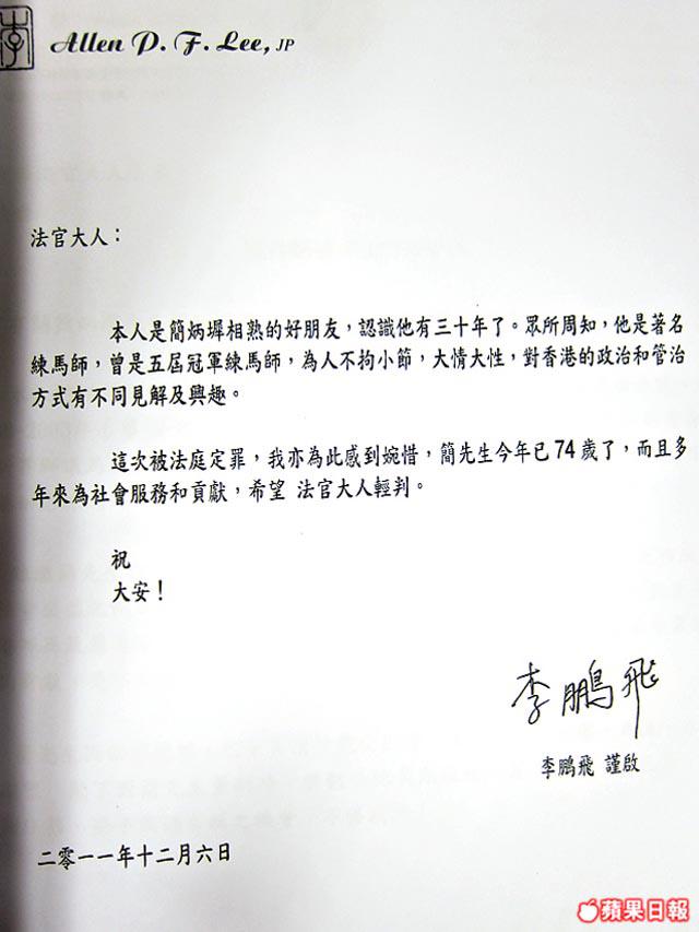 認識簡先生約20年,其大律師兒子簡永輝是我的徒孫。簡先生為人非常慷慨,樂於助人,熱心公務,服務上水鄉委會近20年。當得悉簡先生涉及本案,我感到十分驚訝,是次定罪可能令他失去練馬師資格,對一生愛馬的簡而言,將是個大打擊。
