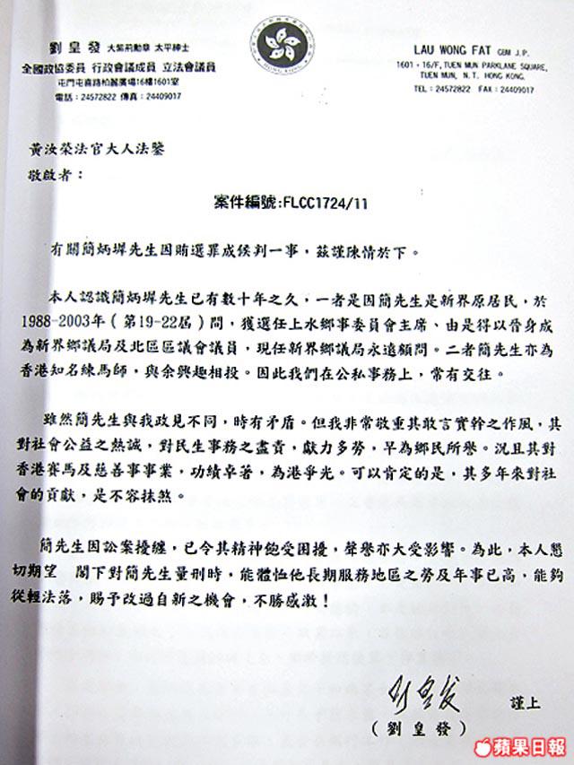 本人是簡炳墀相熟的好朋友,認識30年,簡為人不拘小節,大情大性……今次被法庭定罪,我感到惋惜,簡先生今年已74歲,多年來為社會服務和貢獻,希望法官大人輕判。