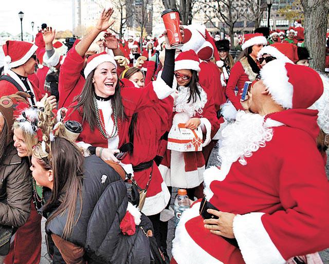 SantaCon是年度盛會,今年有多達31個國家和221個城市響應,在英倫敦特拉法加廣場、美紐約和三藩市等地,都有大批男女老幼的A貨聖誕老人,在街頭開派對,把酒言歡,送禮物,唱聖誕歌,有的則扮聖誕鹿和小精靈搶鏡,齊齊預祝聖誕。