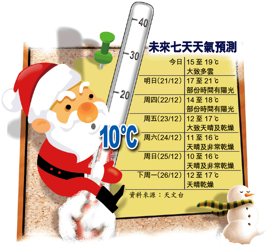 天文台科學主任江偉表示,本港受冬季季候風影響,昨日天氣晴朗及乾燥,巿區氣溫最低僅14℃,隨着一股季候風的補充會在本周後期抵達華南沿岸地區,本港氣溫會再度急趺,周六(24日)平安夜氣溫介乎11℃至16℃之間,是本世紀以來最冷;周日(25日)聖誕日,氣溫更會進一步跌至最低10℃,是繼1984年聖誕日只有8.8度以來,氣溫最低的聖誕正日。
