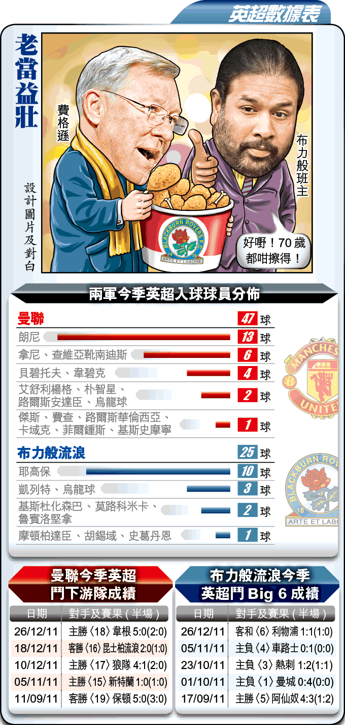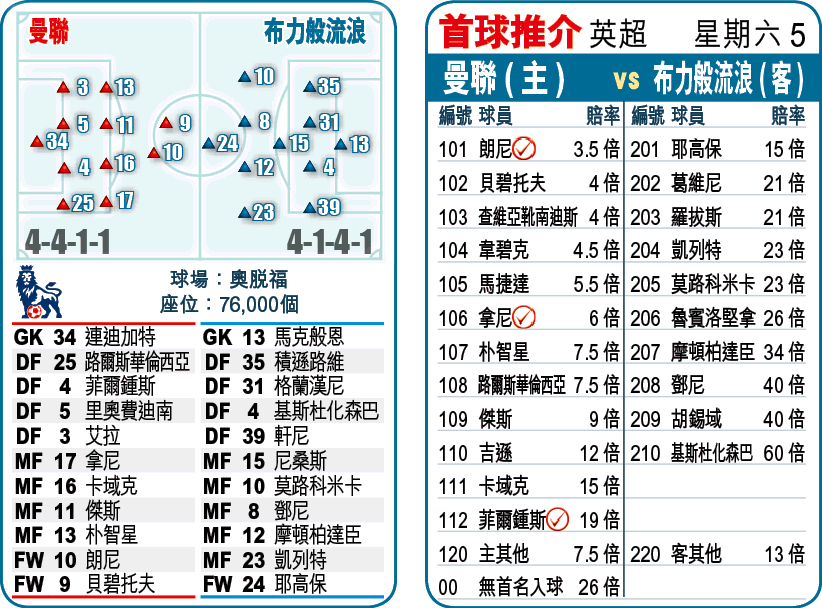 聖誕及新年快車期是曼聯搶分的黃金檔期,頭兩場他們同以5:0大炒對手,周六於第3輪賽事迎戰包尾的布力般流浪,瞓身捧「讓球主客和」[-2]「主勝」,兼取他們贏3:0及5:0波膽。