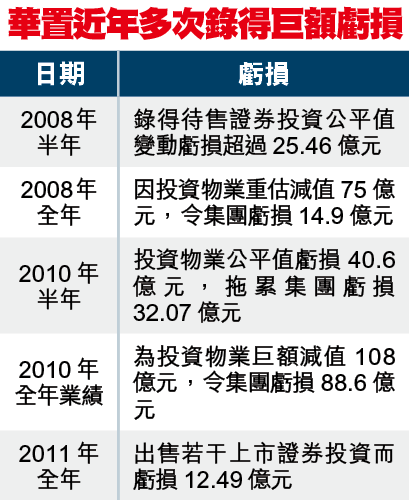 華置截至2011年6月底的中期盈利為45.65億元,當時集團的上市證券分類總收益淨額為1.99億元,意味華置去年下半年在上市證券的表現由贏變輸。有基金經理表示,「以華置百幾億元嘅投資組合,都只係輸12.5億元,已經算少。」他說,除了股市大跌,去年債市亦跌得好「甘」,華置持有不少高息內房債券,相信華置的債券投資亦有一定虧損。