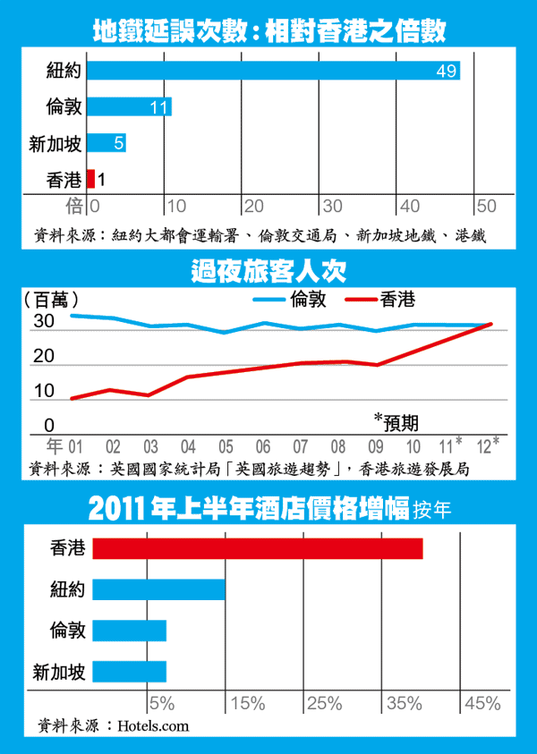 香港的便利和高質服務業吸引了各地旅客源源不絕湧入香港,來港的過夜旅客(即不包括過境轉往其他地方,也是說必定會留港消費起碼一晚的旅客)人次在過去十年上升了超過一倍,在黃金五年氣勢持續下,我們預期香港的過夜旅客人次將於2012年超越倫敦。