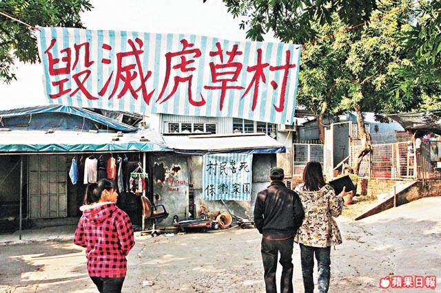 由浮山市集駕車約5分鐘,看見路旁的樹林忽然出現數張血字大橫額「毀滅虎草村」,記者才驚覺已到了村口——村子實在小得毫不起眼。聽到有外來車輛停泊,10多個村民如驚弓之鳥,湧出村口,當中包括小瑛。「你哋係乜嘢人,嚟做乜嘢?」記者表明身份來意,村民還是眼帶疑惑。「我點知你哋係咪間諜?尋日凌晨先有人斬呢棵樹,仲用貨van撞。」小瑛指着村口旁只剩半米樹幹的「樹」質問。