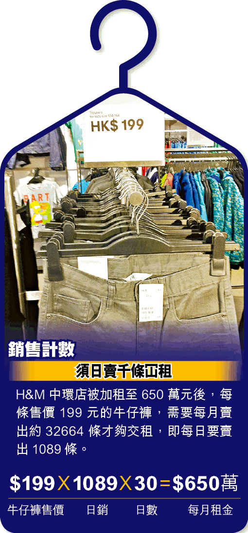 H&M為保市場佔有率,而且同區已無同樣面積的向街巨舖,故終以誠意打動業主續租。據消息人士透露,最新租約月租為650萬元,只加租30%,呎租僅約120元,算是「筍」價。惟新約簽定長達十年租期,設有租金遞增條款,視乎市況每三年會按市值加租一次。換言之,H&M是次敲定續租,一租約擲8億元。