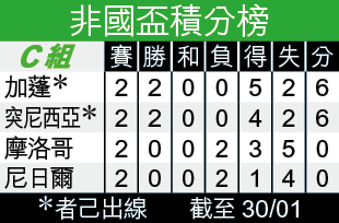 曾於04年捧盃的突尼西亞,過去兩場同以2:1的比數贏摩洛哥及尼日爾,與加蓬一樣提早取得8強入場券。該兩仗他們同是先開紀錄一方,更均於上半場便入波,顯示他們的踢法相當主動,把握力亦強。要留意的是,前鋒麥沙克尼狀態不俗,兩場分組賽入兩球,配合艾拉基、夏基及謝姆等德甲球員,人腳頗強,故無懼加蓬的主場威力,有力於對方身上取得分數。