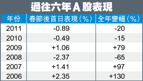 值得一提的是,內地股市春節後首日表現甚具指標效應。自2006年起,A股全年表現都與該年春節後首日表現同步。例如在2011年及2010年,滬指新春首日告跌,該兩年全年股市亦無運行,分別要跌20%及15%;在2006年、2007年、2009年滬指新春首日上升,其後全年亦錄得不少升幅。而2008年新春首日滬指跌108點,該年更出現股災,全年跌65%。如該規律仍然生效,恐怕今年A股凶多吉少。