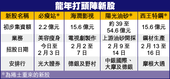 必瘦站「搶閘」做龍年頭炮新股,減價一半後招股價為0.88元,每手4000股入場費約3555.48元。消息稱其國際配售已錄超額,擬2月10日掛牌,集資最多2.2億元。而民營電視劇製作公司海潤影視,則擬本周四(2月2日)招股,14日掛牌,集資最多15.6億元。