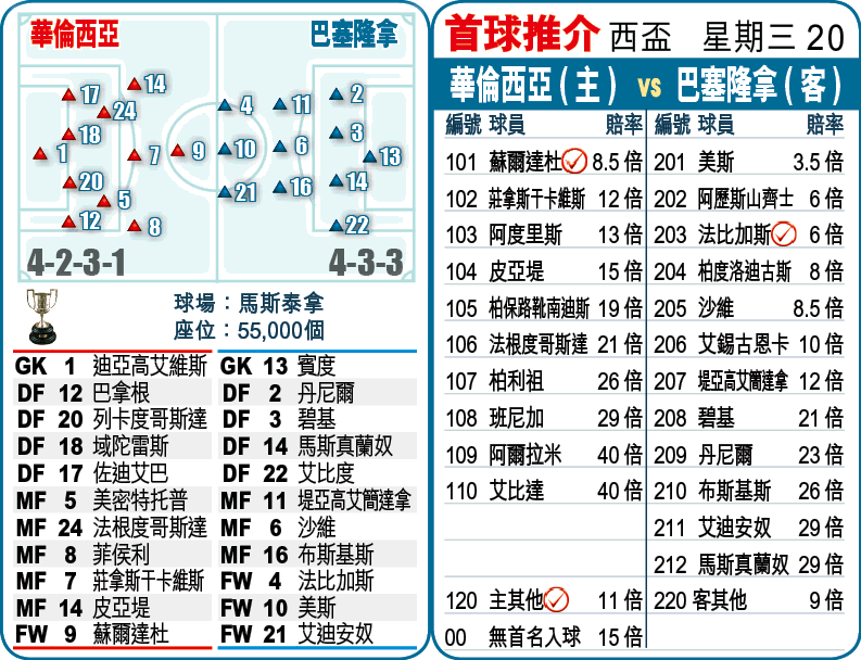 陣容方面,施度基達仍為馬里出戰非國盃,傷兵則有柏度洛迪古斯、恩尼斯達及韋拿等,客軍也料續以後備門將賓度把關,但此子水準一般,近3仗西盃累積4個失球。巴塞近期作客華倫戰績亦差,近6次只得2勝3和1負,今仗客W太熱,寧博「主勝」。