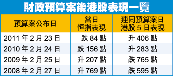 不過,恰巧的是,曾俊華過往4年發表預算案當日恒指表現,與包括預算案日在內的一周表現竟然完全相反。以去年為例,恒指於預算案日上升84點,但連同預算案日在內的一周,恒指總共上升406點。如果港股重覆過往4年的趨勢,明天港股表現,將與其後4個交易日的表現相反,這或能帶來一點點啟示。