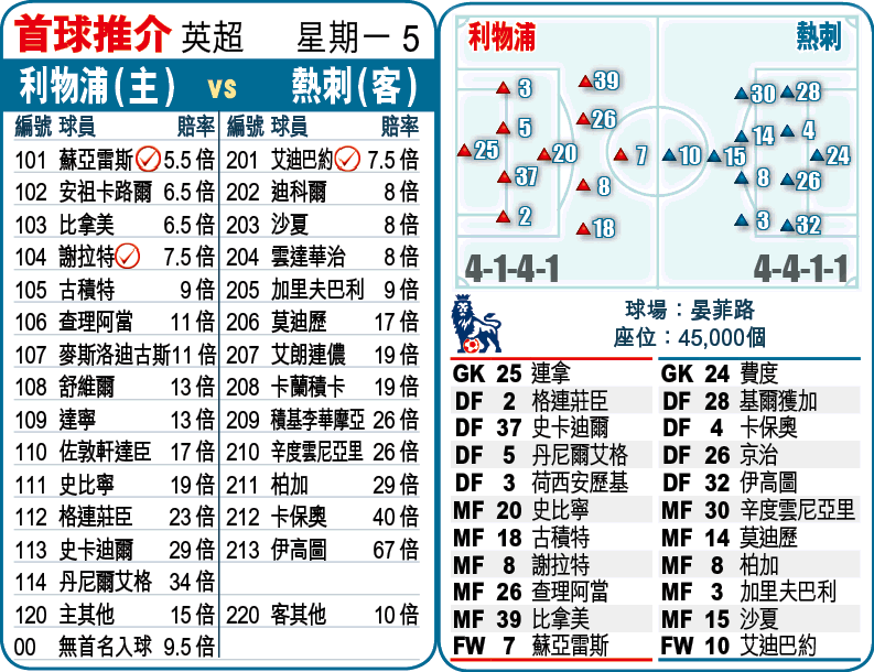 阿蘇返嚟喇!利物浦在周一的英超聯有烏拉圭射手蘇亞雷斯停賽期滿復出,而對手熱刺又攻力十足兼新添了前鋒沙夏,兩隊碰頭,宜取入球開「大」。(球賽編號:星期一5;有線300及200台明日4:00am直播)