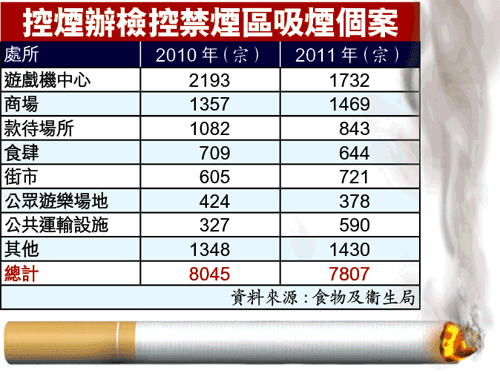 最多人違例吸煙的地方仍是遊戲機中心,去年共檢控1732人,但比前年已減少21%。但是在商場違例吸煙的人則有增加,共1469人,比前年增加8%。在街市吸煙共721人,比前年增加19%。在公共運輸設施吸煙共590人,比前年大增80%。而在食肆、公眾遊樂場包括公園、卡拉OK及夜總會等款待場所違例吸煙的人則有減少。