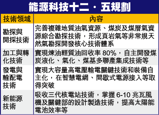 【本報訊】內地將「安全、高效及低碳」定為「十二.五」能源發展方向,國家能源局為配合政策,首次印發《國家能源科技「十二.五」規劃》,冀透過加快轉變四大重點技術領域的能源發展方式,提高能源開發、轉化和利用的效率,但市場認為內地在能源科技核心技術與西方相距甚遠,料仍處學習期,實際效益未顯見。記者:陳韻妍