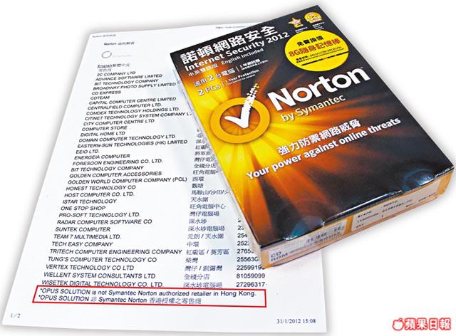 記者到Opus購買同款軟件,同樣不獲送「8GB手指」,並在Symantec官方網站發現授權零售商名單中,列明「OpusSolutions非SymantecNorton香港授權之零售商」。