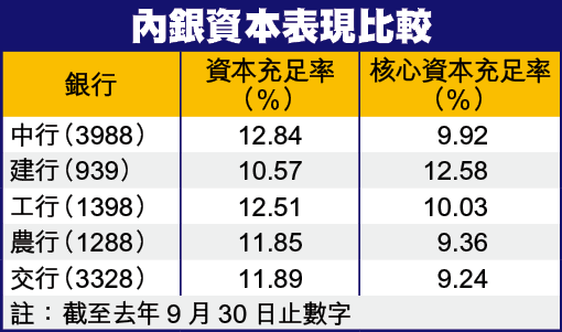 中銀監的新資本要求,隨時造成內銀新一輪集資潮。中央匯金早前宣佈,降低對中行(3988)、工行(1398)及建行(939)的分紅比例5個百分點至35%,料已減輕市場對內銀抽水的憂慮。