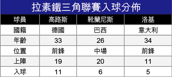 除了首席射手高路斯外,洛基與靴蘭尼斯屬拉素主要入球來源,球隊在過去5場聯賽所取得的10球裏,有8球皆是來自這進攻鐵三角。今仗雖然三缺一,但面對表現持續不振的切塞納已經夠殺。就算拉素上仗輸波,但回到主場作賽可望有更佳演出。開季至今拉素於各項賽事共16場主場比賽只曾兩次被擊敗,當中近3仗全部取勝,包括於月初勇挫AC米蘭一役。