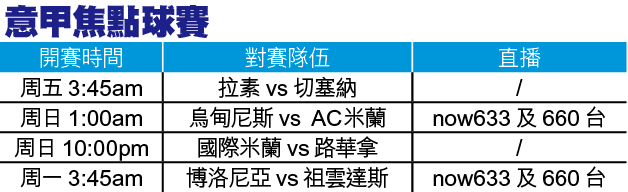 歐洲各大聯賽冠軍之爭依然激烈,為求關乎數千萬歐元的歐聯參賽資格,同樣鬥得如火如荼。英意西德聯賽前列形勢仍然吃緊,意甲今季減至3個歐聯參賽席位,AC米蘭周末作客第3位的烏甸尼斯不容再失。然而失去了伊巴謙莫域,有望擔正的新兵麥斯盧比斯又能否擔大旗,保住歐聯夢?