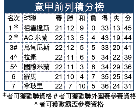 意甲球隊近年在歐戰整體成績欠佳,由今季起已被德甲趕上,淪為只餘下3個歐聯參賽資格可爭逐。AC米蘭在周日聯賽主場失分後,目前多踢一場下落後榜首祖雲達斯1分,爭標仍需努力,另一邊廂亦要提防追兵,與烏甸尼斯、拉素、國際米蘭以至近況回勇的羅馬皆距離不遠,AC於周六意甲作客烏甸尼斯,更要面對沒有伊巴的難關。