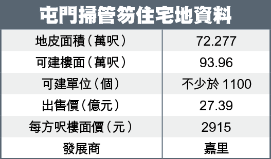 該幅原稱為地王的掃管笏地皮,上周入標的有長實(001)、新地(016)、信置(083)、嘉里、中海(688)、恒地(012)和新世界(017)共7家發展商,最後由近年未有在屯門有項目發展的嘉里奪標。
