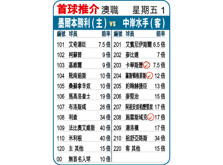 中岸水手上仗在澳職榜首大戰中落敗,但周五作客戰力平平的墨爾本勝利,更有蘇超猛將約翰塞頓加盟,有力收復前失,水手讓平/半,上盤可捧。(球賽編號:星期五1;有線64及204台今日5:00pm直播)