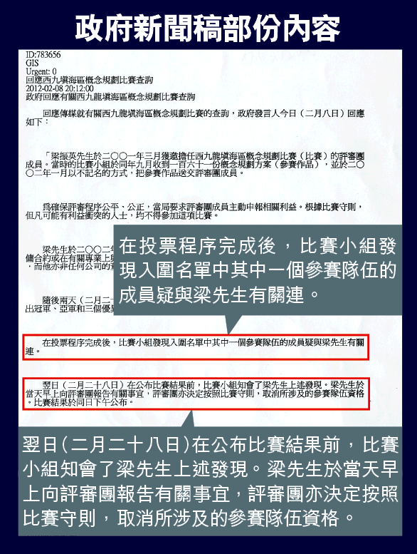 至昨晚8時12分,政府新聞處發出新聞稿「回應傳媒查詢」,詳列事件經過,包括梁振英01年3月獲邀任比賽的評審,同年9月比賽收到161份參賽作品,翌年1月以不記名的方式把作品交評審團成員,並強調政府當年有要求評審團成員主動申報利益。