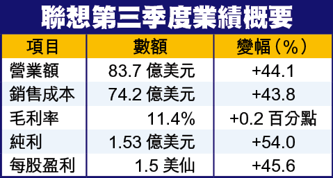 楊元慶承認,全球經濟續波動,復蘇步伐亦不明朗,但聯想對保持增長仍樂觀。至於硬盤驅動器供應短缺及成本上升問題,首席財務官黃偉明預期,硬盤驅動器本季成本不會急升,料與上季相若,集團會透過其他零件成本優勢,抵銷硬盤成本上漲的影響;他指,硬盤供應上月仍然短缺,但相信季末會有改善。聯想上季毛利率按年微升0.2個百分點至11.4%,但較首季度的12.5%及次季度的12.3%明顯下跌。