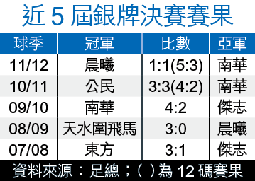 【康寶高級組銀牌(決賽)】南華昨晚在大球場上演的銀牌決賽,以眾凌寡下戰至120分鐘仍未解決晨曦;法定時間賽和1:1的南華,繼上屆決賽12碼不敵公民後再次歷史重演,倒戈的基奧雲尼宴客,12碼輸3:5。連同兩場龍年賀歲盃及前屆的足總盃8強,南華連續5次在12碼落敗。第2次捧走銀牌的晨曦,球員可分逾50萬港元獎金兼取得亞協盃參賽席位。