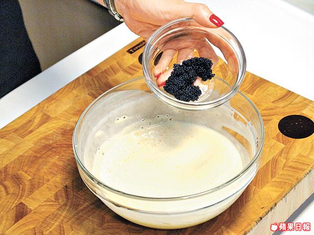 2.繼續加入麥芽糖、魚膠片,每次打溶,拿走熱水,下香檳、淡忌廉、魚子醬拌勻成慕絲。