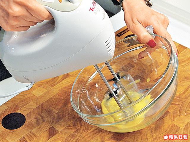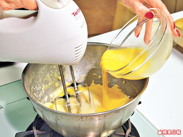 1.蛋黃、雞蛋邊隔熱水邊用電動打蛋器的快打至鬆發呈淡黃色,轉慢速打至企身且沒有氣泡。